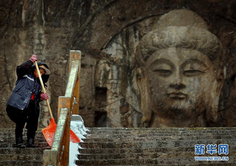 1月9日,清潔工在洛陽龍門石窟景區(qū)內(nèi)的盧舍那大佛前清掃積雪。新華社記者李安攝