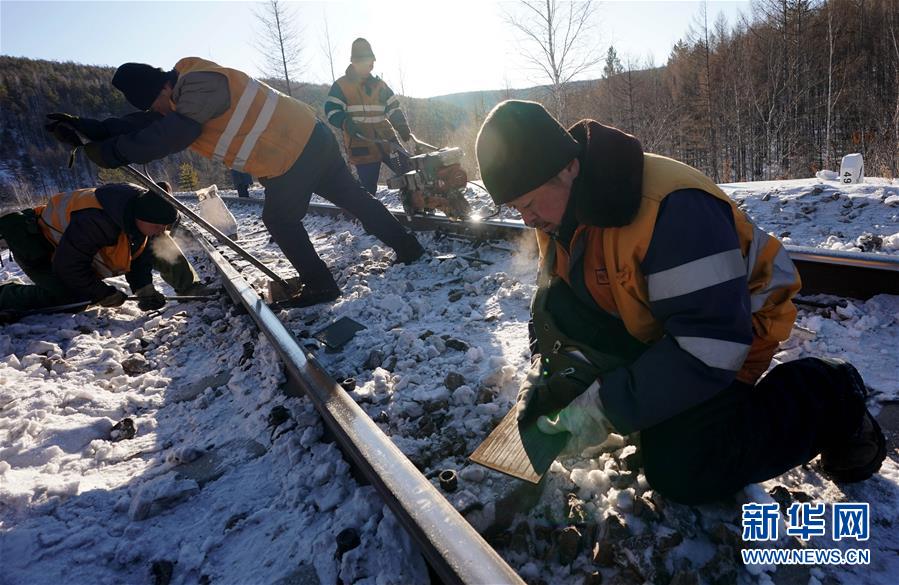1月8日,西羅奇維修工隊工作人員在嫩林線497公里處進行維修作業(yè)。新華社記者王毓國攝