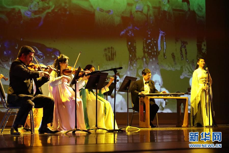 1月11日,在美國休斯敦舉辦的“擁抱春天”晚會上,藝術家演奏大唐樂舞《清平樂》。新華社記者 劉立偉 攝