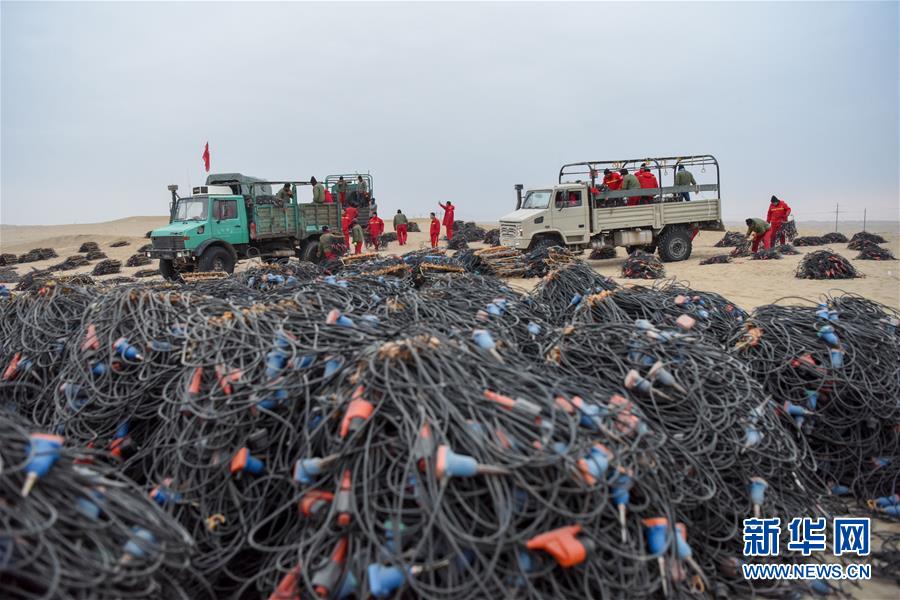 1月14日,放線工在出工前將一捆捆檢波器裝車。地球物理勘探是油氣開發(fā)的第一步,相當(dāng)于給地球做CT。物探工人按照嚴(yán)格的測(cè)線部署,在相應(yīng)位置鉆井,然后實(shí)施地震,采集地震波數(shù)據(jù)。科研人員通過(guò)數(shù)據(jù)組成的“CT片”,就能夠清晰地“看”到地下的地質(zhì)結(jié)構(gòu),判斷哪里埋藏有石油或者天然氣。2019年10月,東方地球物理勘探有限責(zé)任公司塔里木物探處2113隊(duì)進(jìn)入新疆塔克拉瑪干沙漠腹地,開始中古14-21、塔中2兩個(gè)區(qū)塊的三維地震勘探。近2000名物探工人將在1000平方公里的范圍內(nèi)一直工作到2020年4月,這也意味著他們將在塔克拉瑪干沙漠腹地連續(xù)度過(guò)第14個(gè)除夕夜。蘊(yùn)藏著豐富石油天然氣資源的新疆塔克拉瑪干沙漠有“死亡之海”之稱,氣候干燥,年降水量在50毫米以下,冬季地表最低溫度超過(guò)零下30攝氏度,是世界油氣勘探難度最大的地區(qū)之一。為避開風(fēng)季,物探工人每年9、10月份進(jìn)入沙漠,一直工作到來(lái)年4月,夜以繼日與黃沙、嚴(yán)寒為伴,用辛勤的汗水,為祖國(guó)找油找氣。新華社記者丁磊攝