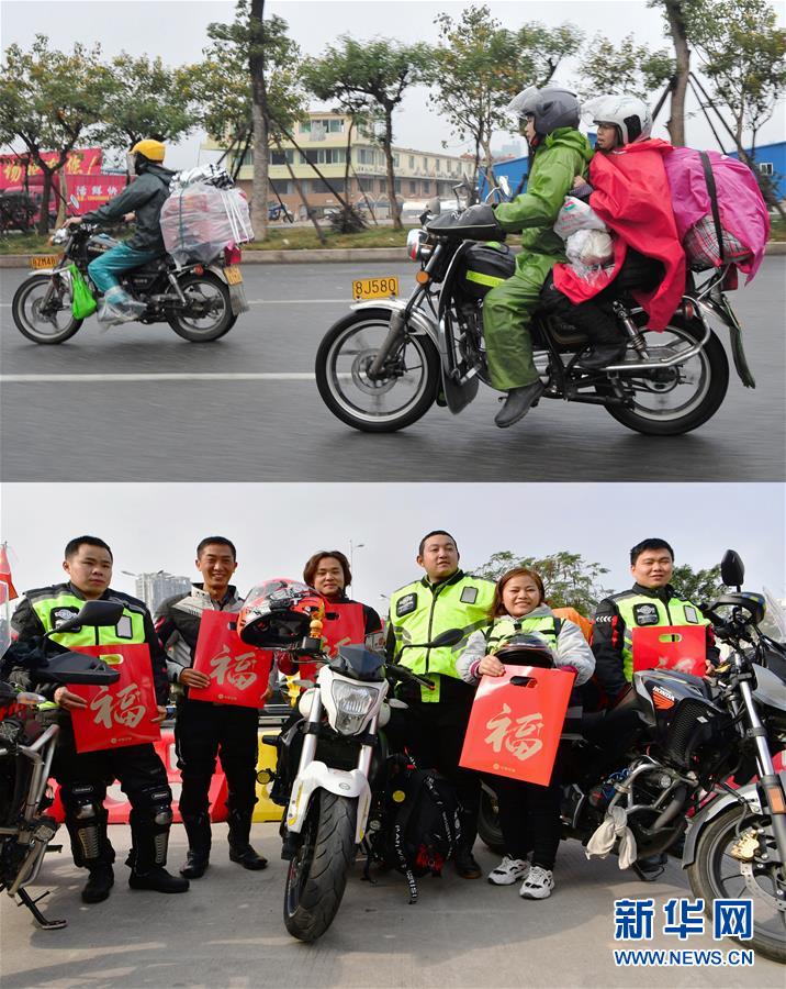拼版照片:上圖是江西、安徽和湖北籍農(nóng)民工組成的返鄉(xiāng)“鐵騎大軍”騎行在返鄉(xiāng)路上(2014年1月23日攝);下圖是“90后”外來務(wù)工返鄉(xiāng)青年冉曉紅(左三)和騎友們在中石油漳州龍江路加油站合影留念(1月15日攝)。20歲的冉曉紅是重慶人,在福建廈門從事餐飲業(yè),2019年買了一輛高檔摩托車,2020年與朋友結(jié)伴騎摩托車返鄉(xiāng),路上預(yù)計需要五天時間。 新華社記者 魏培全 攝