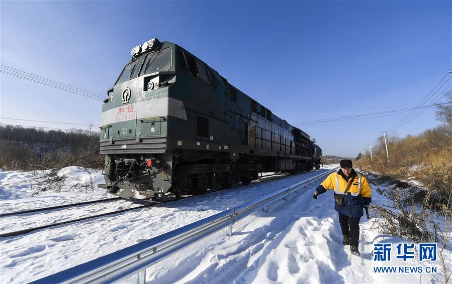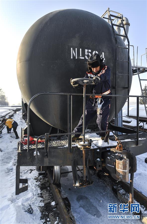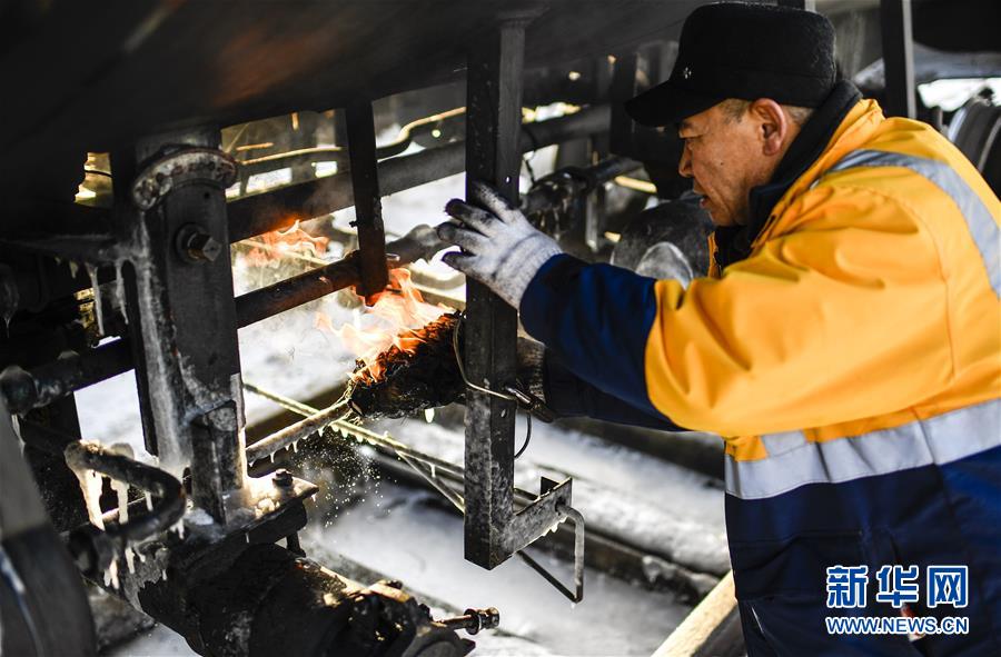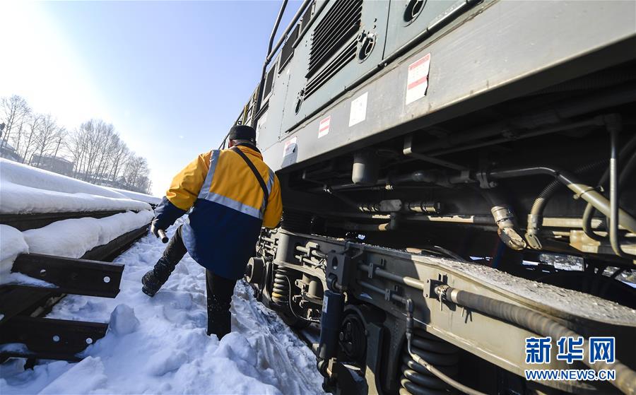 林海間的“送水小火車” 調(diào)車員對(duì)“送水小火車”進(jìn)行出行前的檢查作業(yè)(1月17日攝)。新華社記者 許暢 攝
