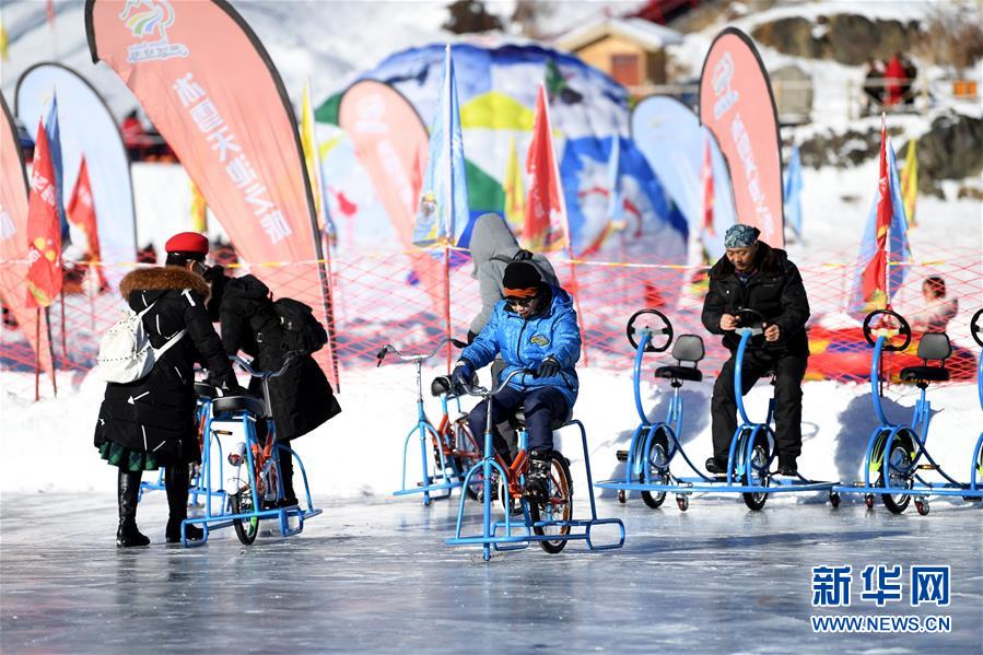 1月18日,游客在新疆天池景區(qū)玩冰上自行車。新華社記者 沙達(dá)提 攝