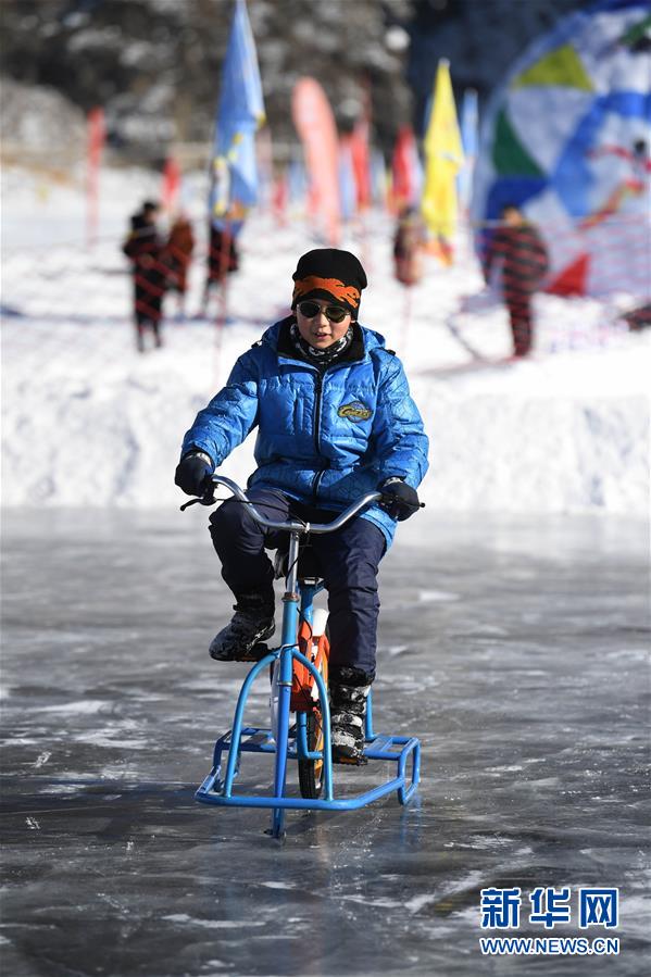 1月18日,游客在新疆天池景區(qū)玩冰上自行車。新華社記者 沙達(dá)提 攝