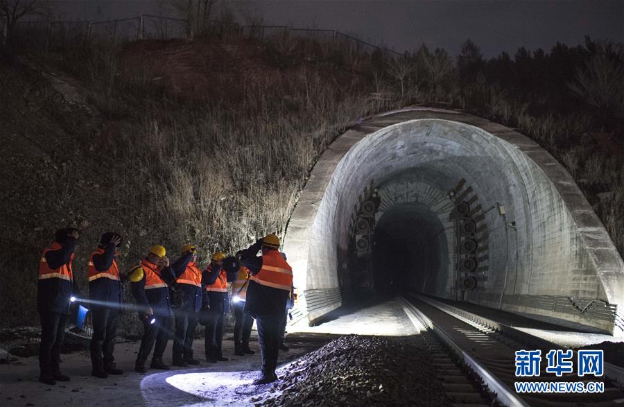 1月9日,在加格達(dá)奇工務(wù)段西羅奇嶺二號隧道,西羅奇維修工隊(duì)工作人員在避車洞內(nèi)躲避列車。新華社記者王毓國攝