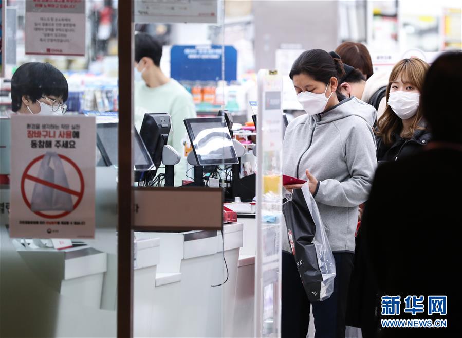 2月24日,在韓國首爾,當?shù)鼐用裨邶埳絽^(qū)一家日用品商店排隊結(jié)賬。 新華社記者 王婧嬙 攝
