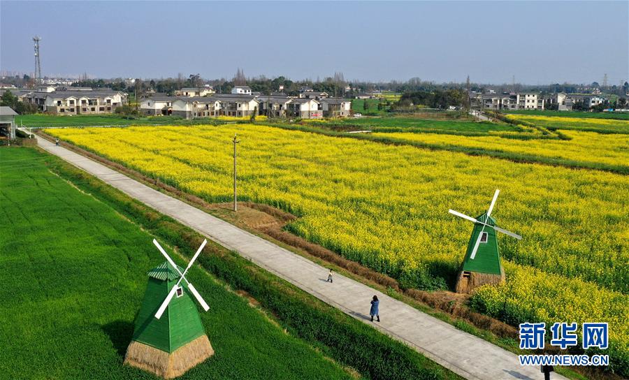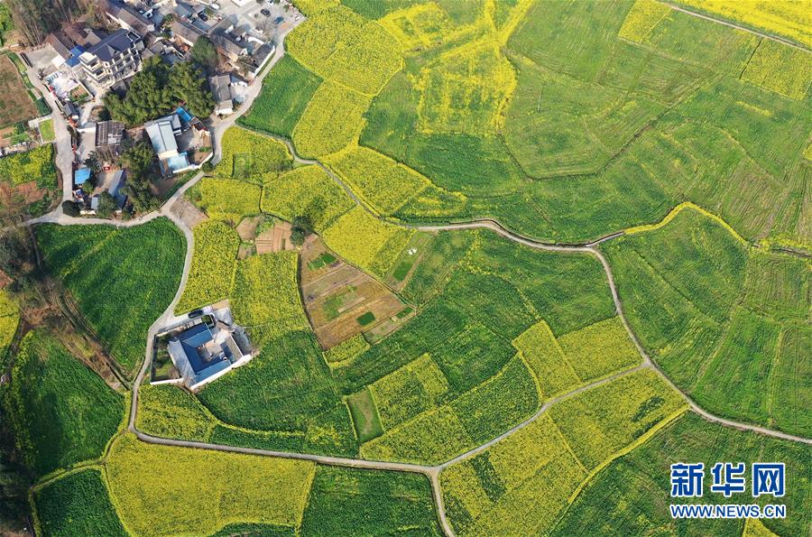 2月24日在四川省大邑縣安仁鎮(zhèn)永興村拍攝的油菜花田(無人機(jī)照片)。 新華社記者 王曦 攝
