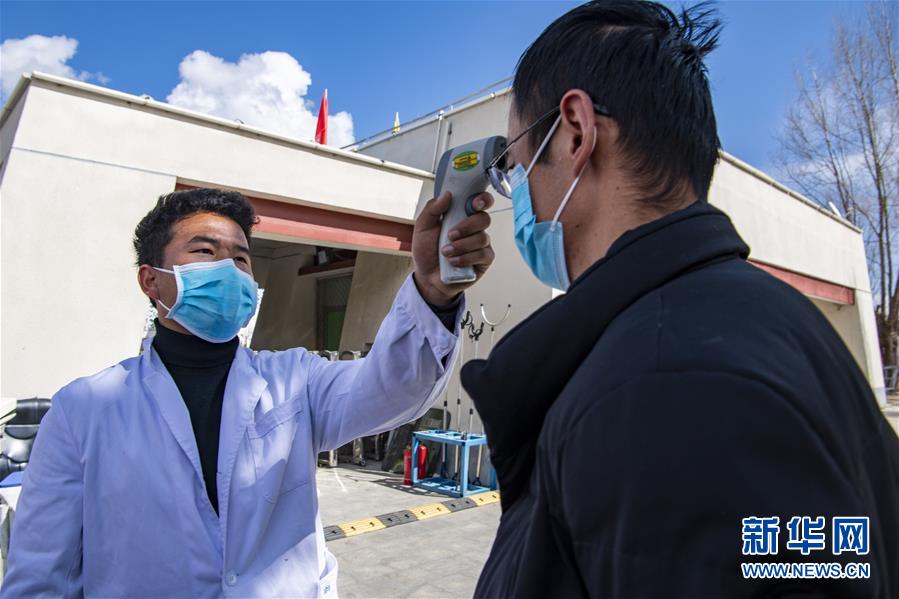 西藏大學(xué)醫(yī)學(xué)院預(yù)防專業(yè)本科生次成郎加(左)在學(xué)校門口為來校者測量體溫(2月23日攝)。新華社記者孫非攝