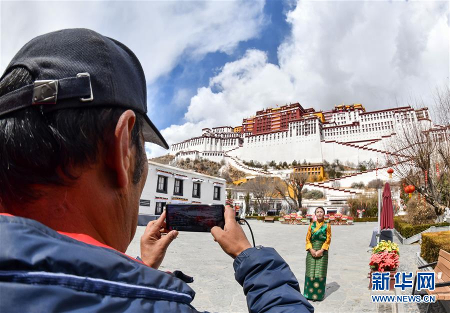 3月1日,布達(dá)拉宮管理處講解員次仁卓嘎(左)在進(jìn)行直播。新華社記者春拉攝