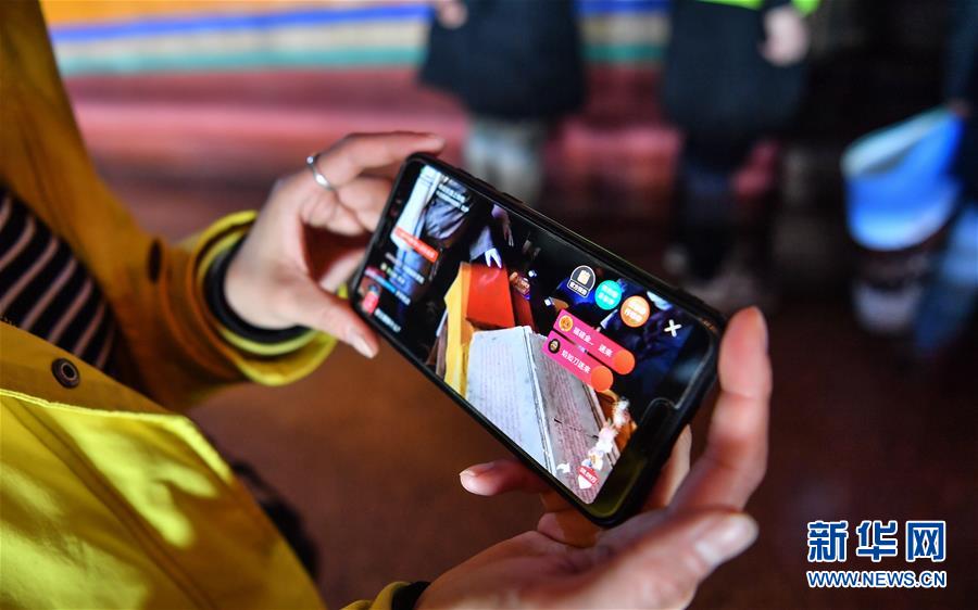 3月1日,布達拉宮管理處講解員次仁卓嘎展示手機上的直播界面。新華社記者晉美多吉攝
