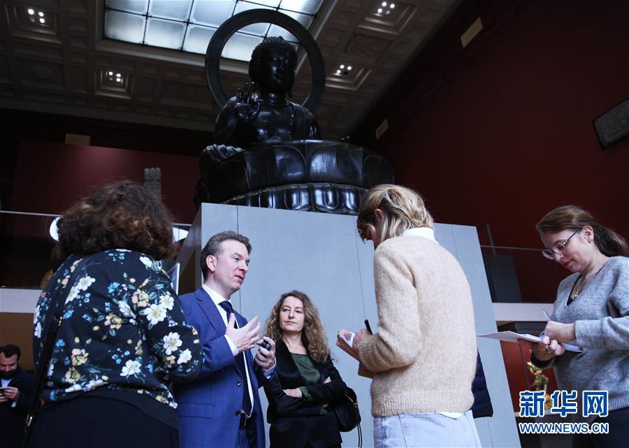 3月2日,在法國巴黎,賽努奇亞洲藝術博物館館長埃里克·勒菲弗(左二)接受媒體采訪。法國巴黎賽努奇亞洲藝術博物館經(jīng)過數(shù)月修繕后2日迎客,以更加豐富的展品、全新場景布置和多媒體呈現(xiàn)方式向觀眾展示中國文化和亞洲文化魅力。新華社記者高靜攝