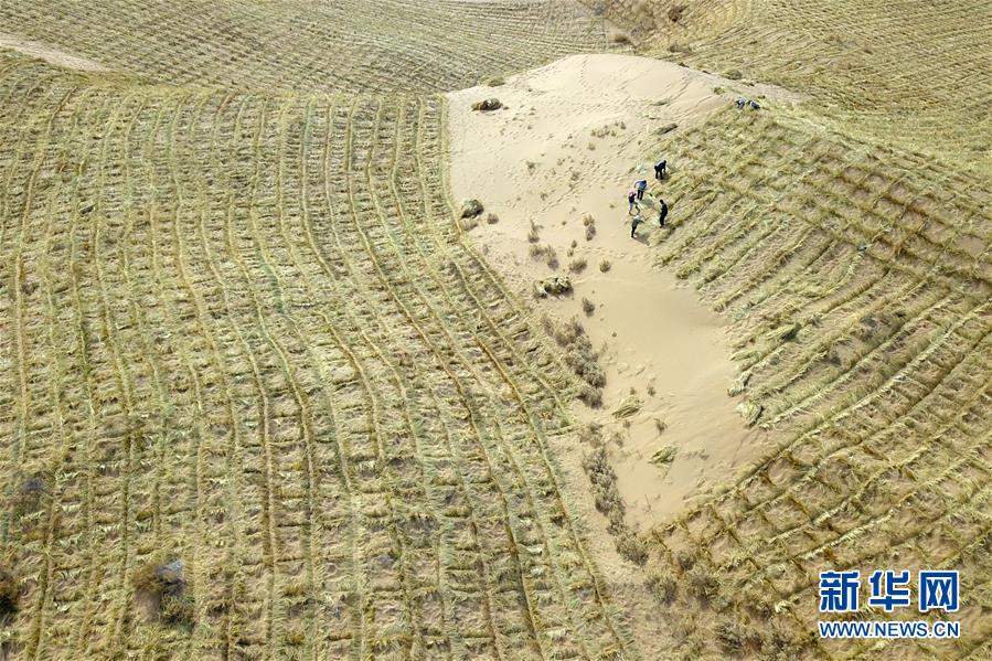 3月5日,在古浪縣北部沙區(qū)旱麻崗治沙點(diǎn),群眾扎草方格壓沙(無(wú)人機(jī)照片)。初春時(shí)節(jié),在騰格里沙漠南緣的甘肅省武威市古浪縣,當(dāng)?shù)馗刹柯毠ぜ鞍瞬缴沉謭?chǎng)治沙人共同在縣城北部沙區(qū)旱麻崗治沙點(diǎn)開(kāi)展春季治沙勞動(dòng)。新華社記者 范培珅 攝