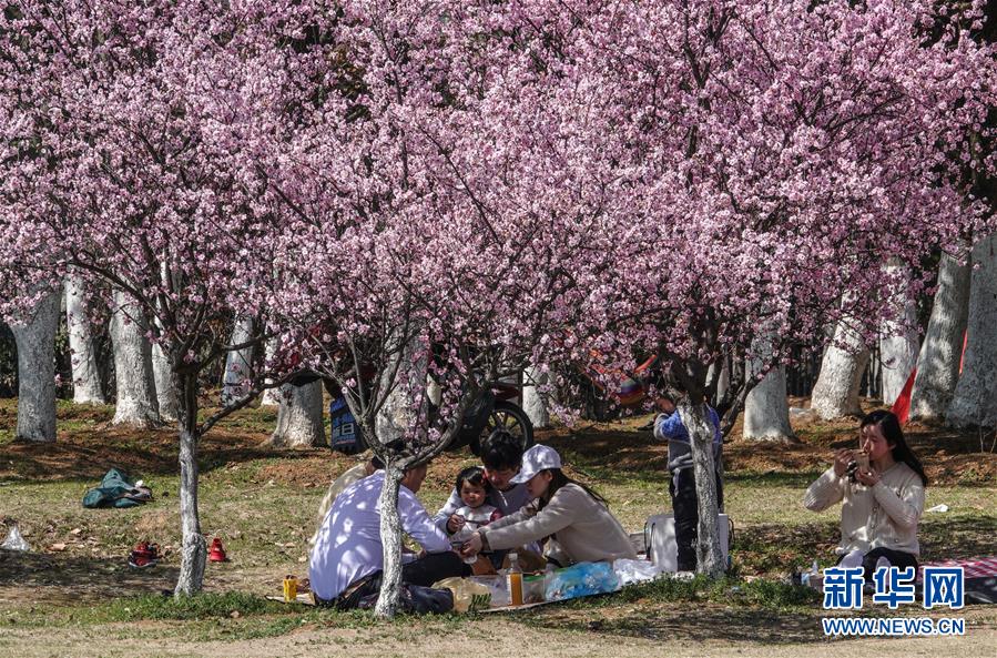 3月15日,在南京東郊體育公園,市民在櫻花樹下休息賞櫻。 當日,南京風和日麗,市民們來到東郊體育公園,踏青春游。 新華社記者 楊磊 攝