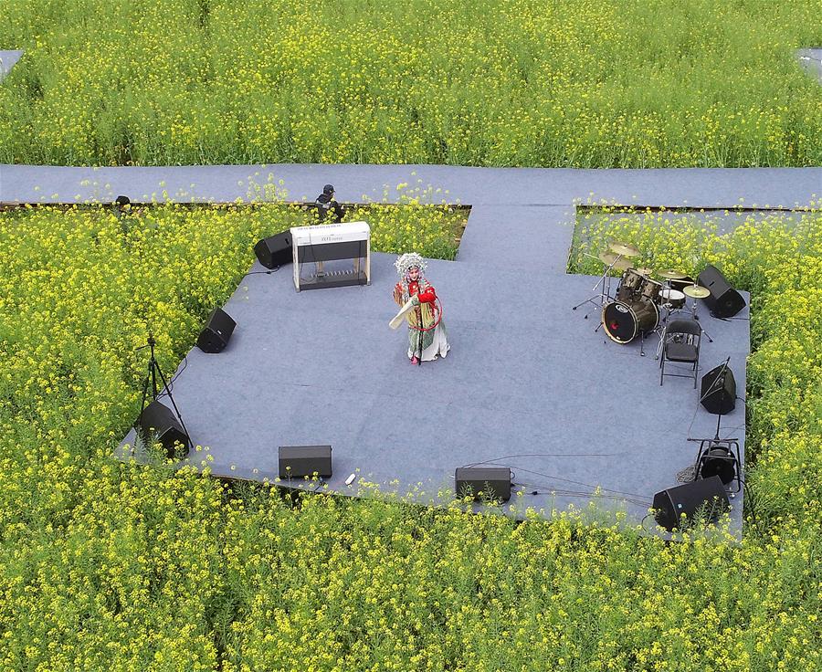 3月16日,演員在李坑村的“花田音樂會(huì)”上表演戲曲(無人機(jī)照片)。 新華社記者 萬象 攝
