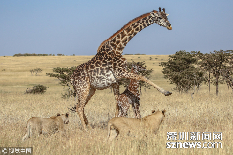 當(dāng)?shù)貢r(shí)間2018年8月15日,肯尼亞馬賽馬拉,當(dāng)?shù)貙?dǎo)游詹姆斯·納帕索(James Nampaso)拍攝到一群獅子圍攻母長(zhǎng)頸鹿和她的幼崽。盡管長(zhǎng)頸鹿勇敢地抵抗獅群的進(jìn)攻,但當(dāng)一頭母獅跳上它的脊背時(shí),它被分散了注意力,使得獅群最終捕獲了它的孩子。