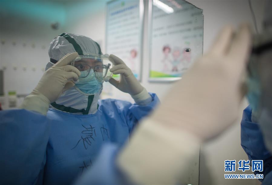 3月19日,在武漢市肺科醫(yī)院清潔區(qū),內蒙古醫(yī)療隊隊員在穿戴護目鏡。  新華社記者 肖藝九 攝