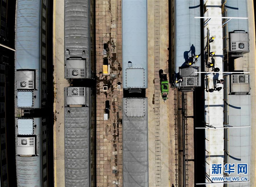 3月19日,鄭州車輛段客車檢車員在登頂平臺上對客車空調(diào)機組進行檢修作業(yè)(無人機照片)。新華社記者 李安 攝