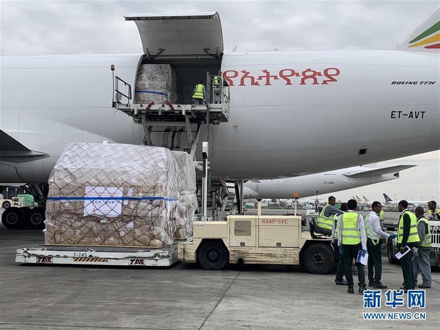 3月22日,在埃塞俄比亞首都亞的斯亞貝巴國(guó)際機(jī)場(chǎng),工作人員將中國(guó)援助的抗疫物資運(yùn)下飛機(jī)。歷時(shí)10小時(shí)飛行,滿(mǎn)載著來(lái)自中國(guó)抗疫物資的埃航貨運(yùn)包機(jī)22日上午抵達(dá)埃塞俄比亞首都亞的斯亞貝巴的國(guó)際機(jī)場(chǎng),這是馬云公益基金會(huì)和阿里巴巴公益基金會(huì)捐贈(zèng)非洲的部分醫(yī)療物資,用于支援非洲54國(guó)抗擊疫情。新華社記者王守寶攝