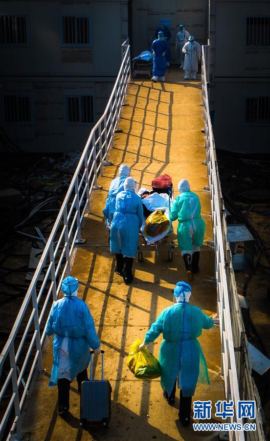 醫(yī)護(hù)人員將患者轉(zhuǎn)運至武漢火神山醫(yī)院病房(2月4日攝,無人機(jī)照片)。新華社記者肖藝九攝