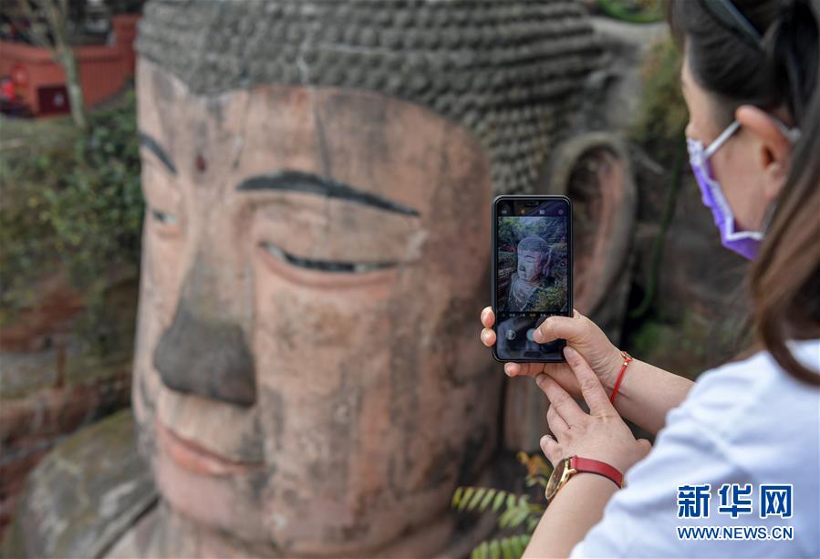 3月23日,一位游客在樂山大佛景區(qū)內(nèi)用手機(jī)拍攝。新華社記者張超群攝
