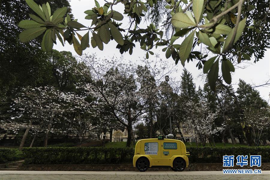 一輛5G無(wú)人攝像車在武漢大學(xué)櫻花大道進(jìn)行不間斷無(wú)人巡游,實(shí)時(shí)采集和傳輸直播圖像信號(hào)(3月16日攝)。新華社記者費(fèi)茂華攝