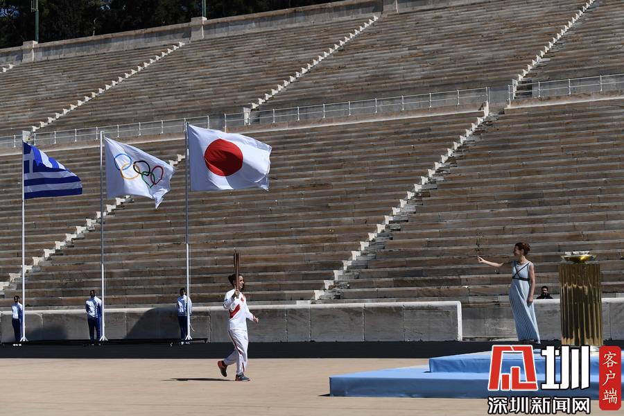 3月19日,日本代表團成員井本直步子(右)從希臘奧委會主席斯皮羅斯·卡普拉洛斯手中接過東京奧運會圣火火炬。