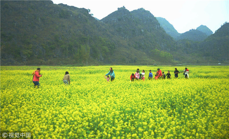 2019年2月5日,廣西來賓,當天是農歷大年初一,人們在忻城縣城關鎮(zhèn)隆光村油菜花海中賞花游玩。