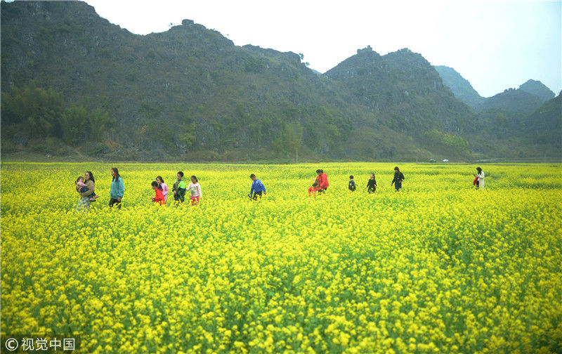 2019年2月5日,廣西來(lái)賓,當(dāng)天是農(nóng)歷大年初一,人們?cè)谛贸强h城關(guān)鎮(zhèn)隆光村油菜花海中賞花游玩。