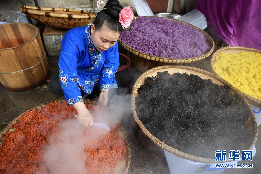 4月17日,在貴州省臺江縣姊妹街哆蝶五彩姊妹飯體驗店,苗家婦女在攤晾五彩“姊妹飯”。新華社記者楊文斌攝