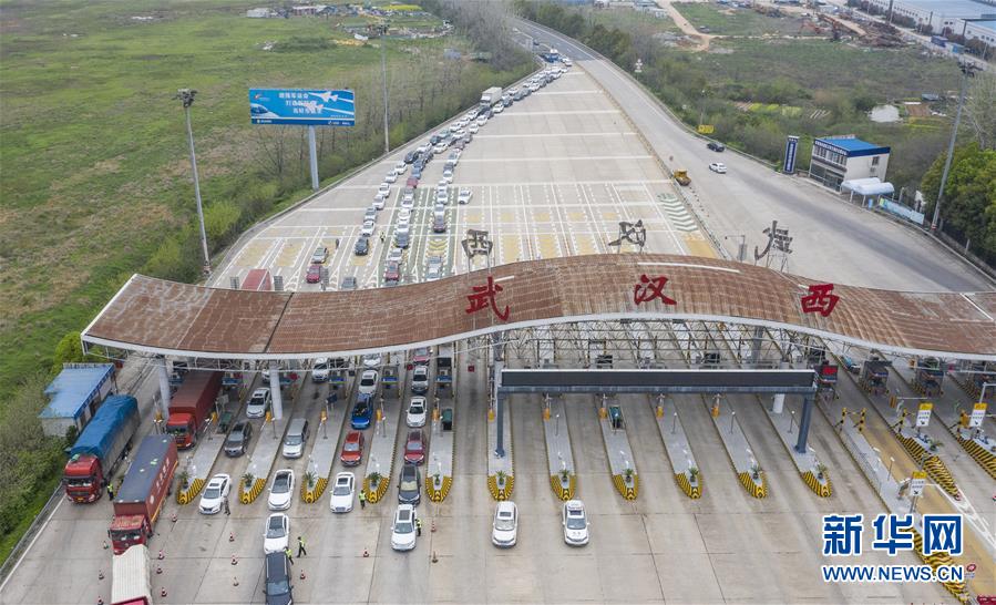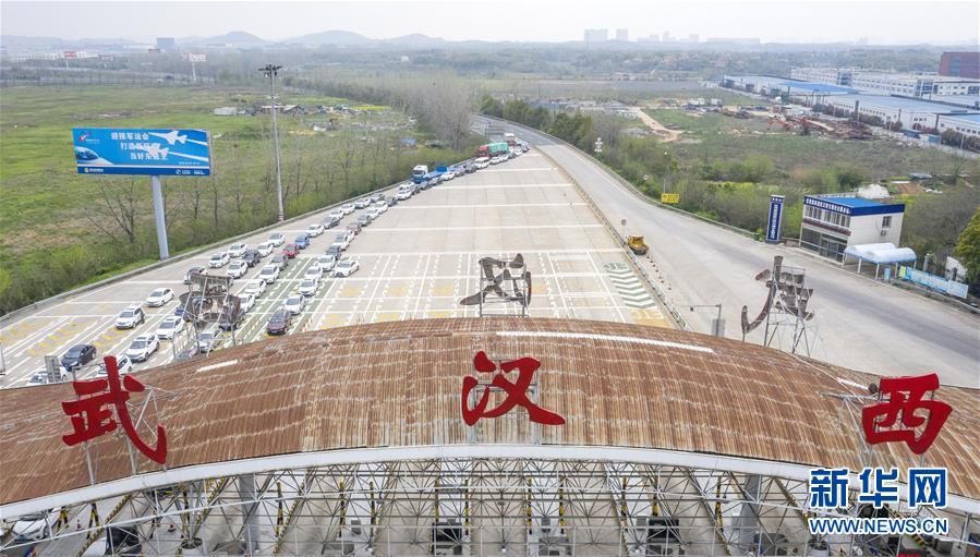 3月24日,在武漢西高速收費(fèi)站交通卡點(diǎn),返漢車輛排隊(duì)等候入城(無人機(jī)照片)。當(dāng)日,湖北省新冠肺炎疫情防控指揮部發(fā)布通告說,湖北省除武漢市以外地區(qū),將于3月25日起解除離鄂通道管控,武漢市將于4月8日起解除離漢離鄂通道管控措施。隨著近日武漢部分企業(yè)逐漸復(fù)產(chǎn)復(fù)工,進(jìn)入武漢的返城務(wù)工人員陸續(xù)增多,車輛在武漢西高速收費(fèi)站交通卡點(diǎn)有序排隊(duì)返回武漢。工作人員對返城人員檢查體溫,并核查證明健康的“綠碼”和身份證后放行。新華社記者才揚(yáng)攝