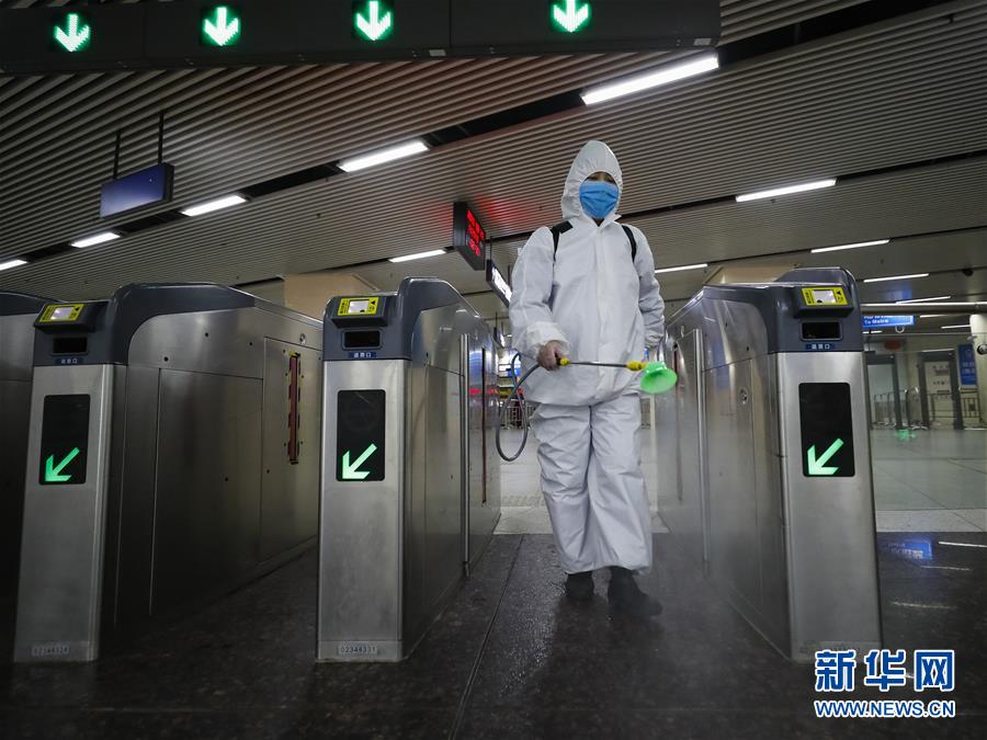 3月23日,在漢口火車站地鐵站,保潔人員在為站廳乘客通道消毒。目前,武漢城市功能和市民生活正逐步有序恢復(fù),地鐵、公交車系統(tǒng)已啟動全面消殺和張貼乘客健康二維碼識別等舉措,為恢復(fù)運(yùn)營做準(zhǔn)備。新華社記者沈伯韓攝