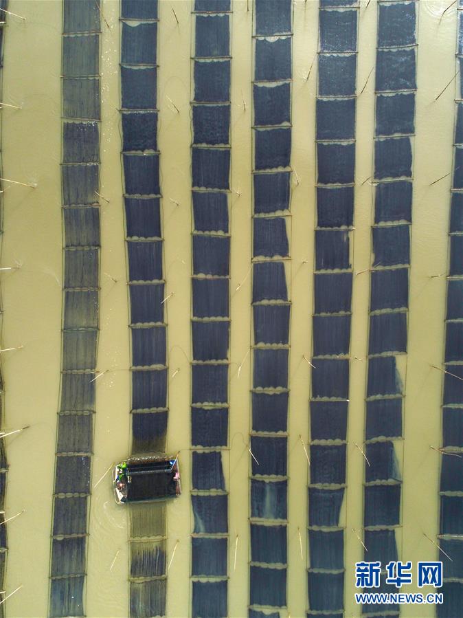 11月4日,漁民在霞浦縣三沙鎮(zhèn)的紫菜種植區(qū)收獲紫菜(無人機拍攝)。近日,福建省霞浦縣沿海6萬畝紫菜迎來收獲季節(jié),漁民們出海收獲紫菜,海上田園一派繁忙豐收景象。新華社記者姜克紅攝