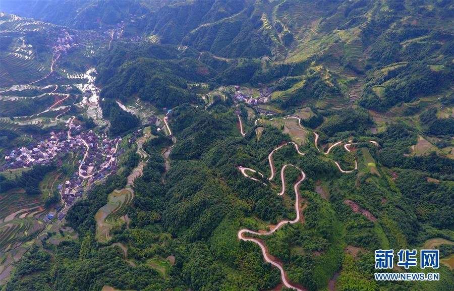 這是融水苗族自治縣桿洞鄉(xiāng)百秀村孔門苗寨的公路(6月14日無(wú)人機(jī)拍攝)。新華社記者黃孝邦攝