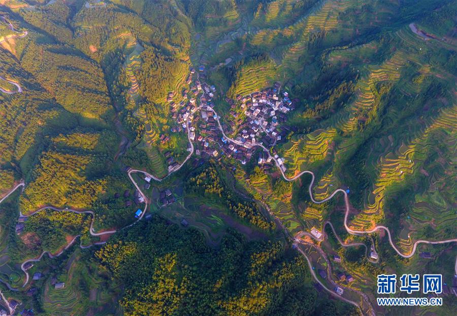 這是融水苗族自治縣桿洞鄉(xiāng)小河村高羽苗寨的木樓和梯田(3月31日攝,無(wú)人機(jī)照片)。新華社記者黃孝邦攝