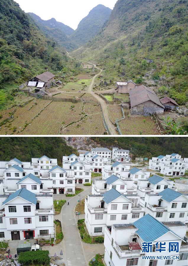 拼版照片:上圖為廣西環(huán)江毛南族自治縣大安鄉(xiāng)可愛村肯愛屯(無人機(jī)照片,2017年3月14日攝);下圖為廣西環(huán)江毛南族自治縣大安鄉(xiāng)可愛村移民新村(無人機(jī)照片,2017年3月14日攝)。