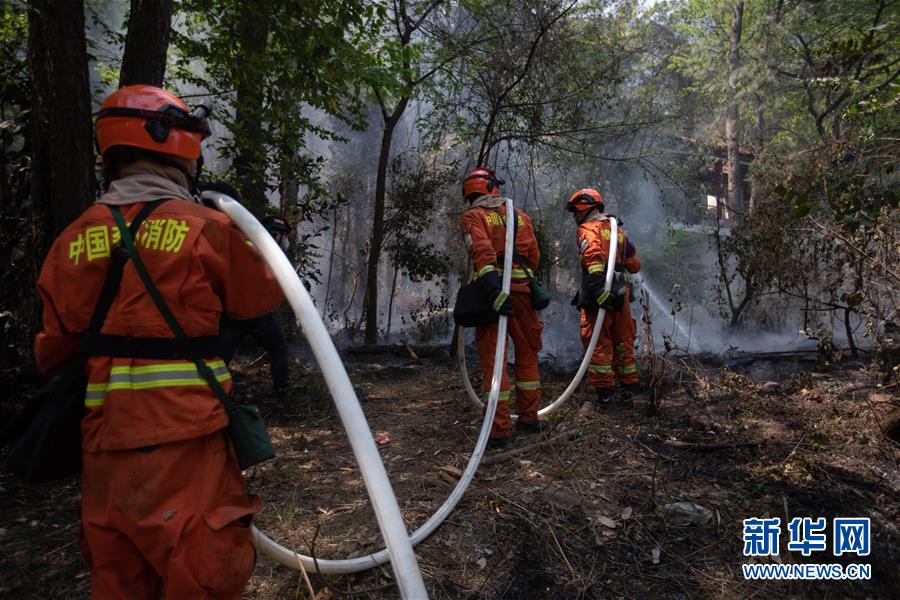 4月1日,四川省森林消防總隊隊員用水撲滅余火和煙點。新華社記者江宏景攝