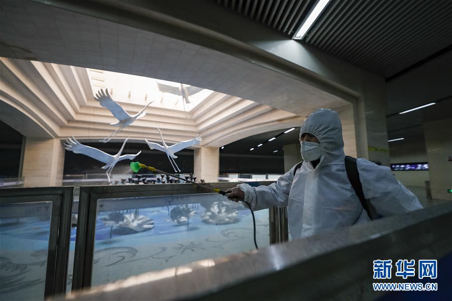 3月23日,在漢口火車站地鐵站,保潔人員在為站廳乘客通道消毒。目前,武漢城市功能和市民生活正逐步有序恢復(fù),地鐵、公交車系統(tǒng)已啟動(dòng)全面消殺和張貼乘客健康二維碼識(shí)別等舉措,為恢復(fù)運(yùn)營(yíng)做準(zhǔn)備。新華社記者沈伯韓攝