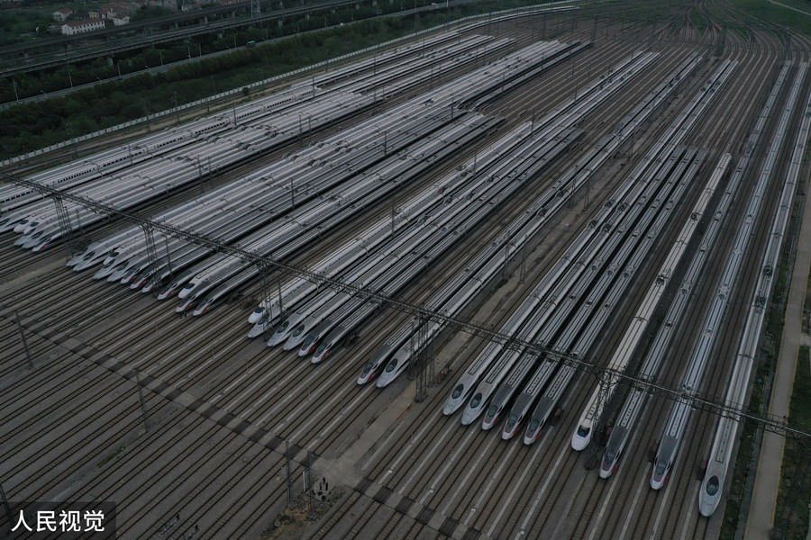 2020年4月6日,武漢動車段高鐵動車組整裝待發(fā)(無人機照片)。