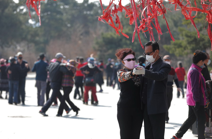 2020年4月6日,遼寧沈陽,北陵公園在清明小長假的最后一天,游客猛增。市民對各項游戲都踴躍參與。圖為伴著歡快優(yōu)美的樂曲,大爺大媽們紛紛起舞。