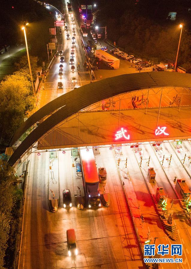 4月8日凌晨,車輛通過(guò)武漢西高速收費(fèi)站(無(wú)人機(jī)拍攝)。 新華社記者 沈伯韓 攝