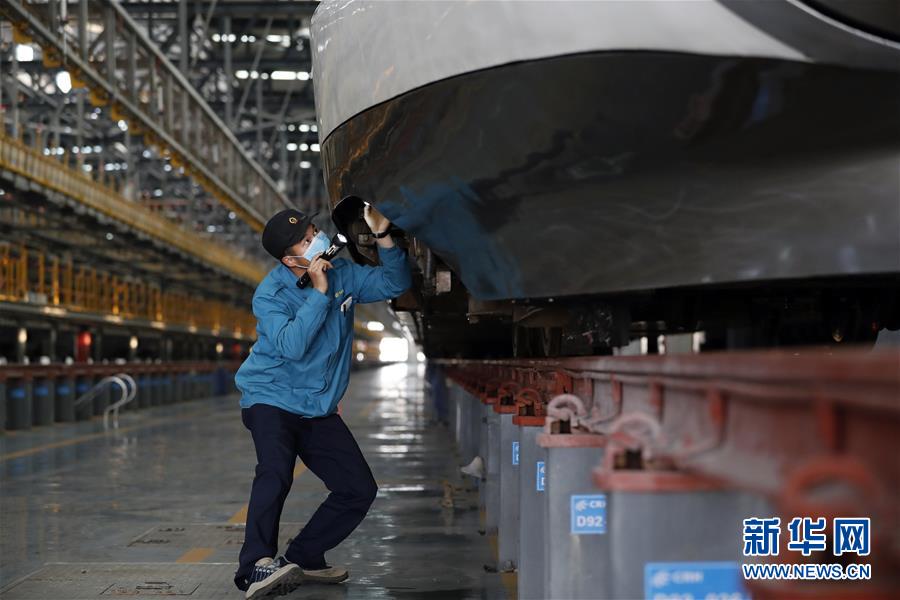 4月7日,武漢動車段運用車間地勤機械師程廣在檢查車底走行部。 新華社記者 沈伯韓 攝