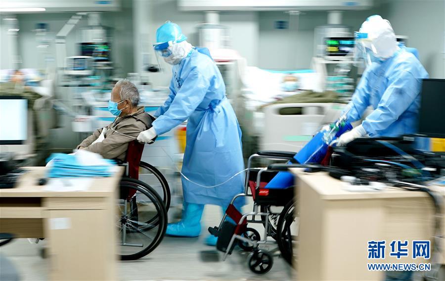 3月20日,武漢火神山醫(yī)院重癥醫(yī)學(xué)一科副主任宋立強(qiáng)(中)護(hù)送81歲的新冠肺炎重癥患者去做CT檢查。為確?;颊哂谐渥愎┭酰t(yī)生胡世頡推著氧氣瓶隨行。 新華社記者 王毓國(guó) 攝