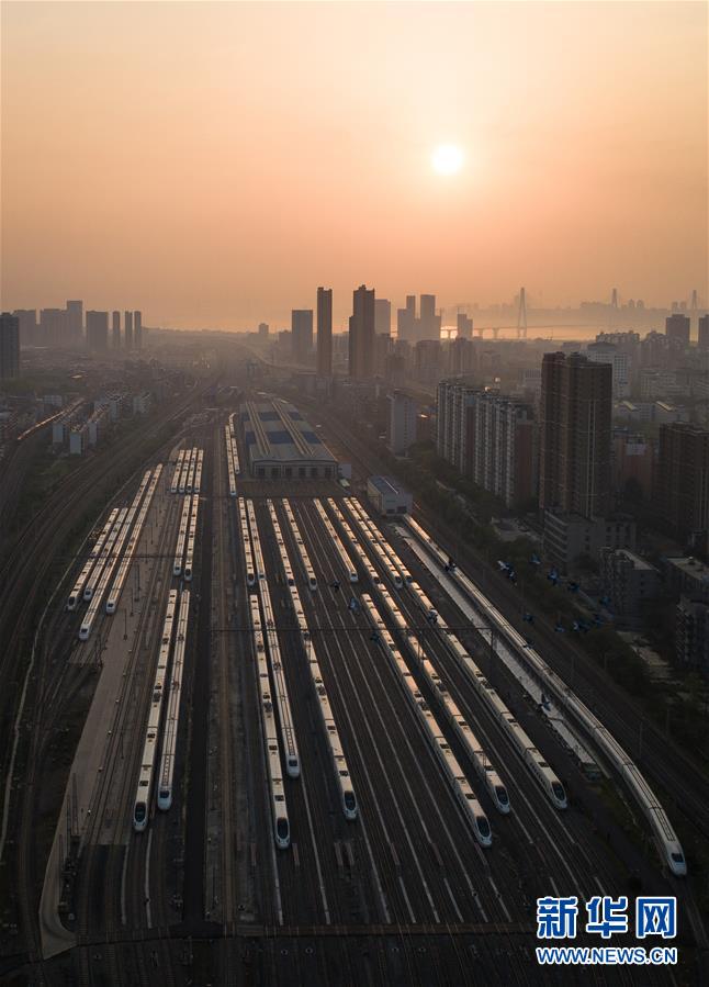 4月8日,在武漢動(dòng)車段,列車??吭诖孳嚲€上準(zhǔn)備投入運(yùn)行(無人機(jī)照片)。當(dāng)日,武漢市正式解除離漢離鄂通道管控措施,幾十組在武漢動(dòng)車段經(jīng)過檢修消殺的動(dòng)車組,猶如“陸地艦隊(duì)”??吭诖孳嚲€上,蓄勢(shì)待發(fā),重新啟程。 新華社記者 肖藝九 攝