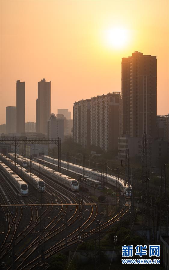 4月8日,在武漢動(dòng)車段,列車??吭诖孳嚲€上準(zhǔn)備投入運(yùn)行。 新華社記者 肖藝九 攝