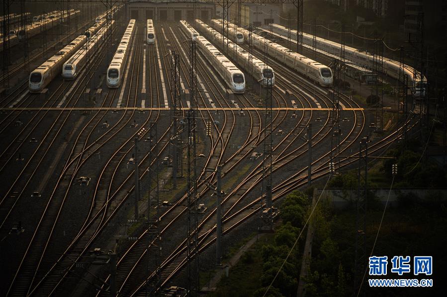 4月8日,在武漢動車段,列車??吭诖孳嚲€上準備投入運行。 新華社記者 肖藝九 攝