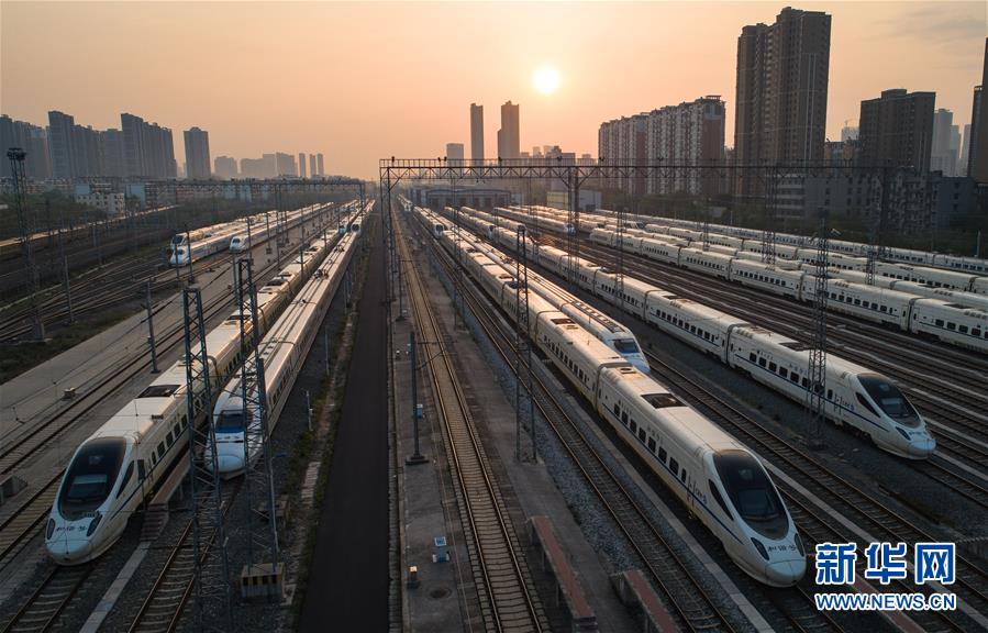 4月8日,在武漢動(dòng)車段,列車停靠在存車線上準(zhǔn)備投入運(yùn)行(無(wú)人機(jī)照片)。  新華社記者 肖藝九 攝
