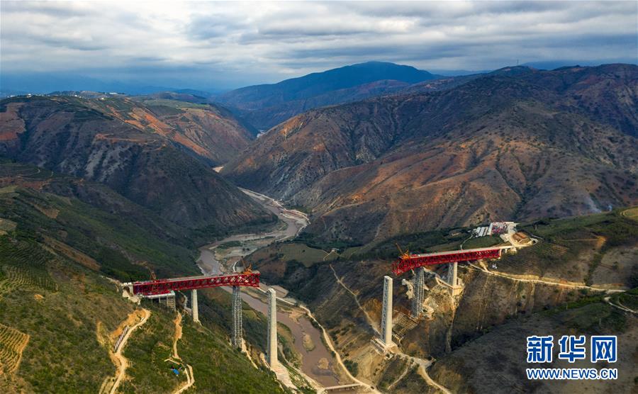 3月5日,空中俯瞰建設中的中老鐵路元江特大橋(無人機照片)。近期,中老鐵路玉溪至磨憨段有序復工復產,由中鐵四局承建的中老鐵路全線重點控制性工程——元江特大橋、南溪河特大橋正在加緊施工建設。新華社記者江文耀攝