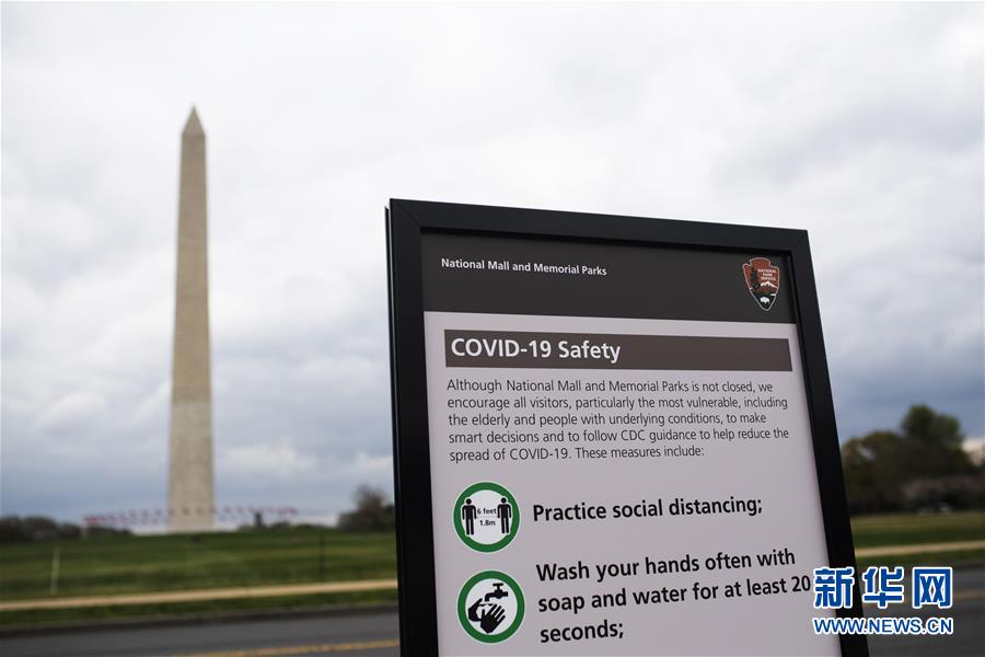 這是4月1日在美國華盛頓紀念碑附近拍攝的新冠肺炎疫情防控提示牌。新華社記者劉杰攝