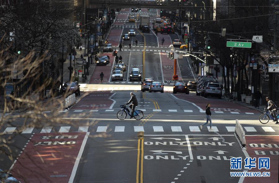 3月21日,在美國紐約第二大道,人們戴口罩騎車出行。新華社記者王迎攝