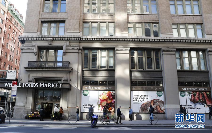 3月21日,在美國紐約,人們排隊時保持距離,準備進入一家超市購物。新華社記者王迎攝